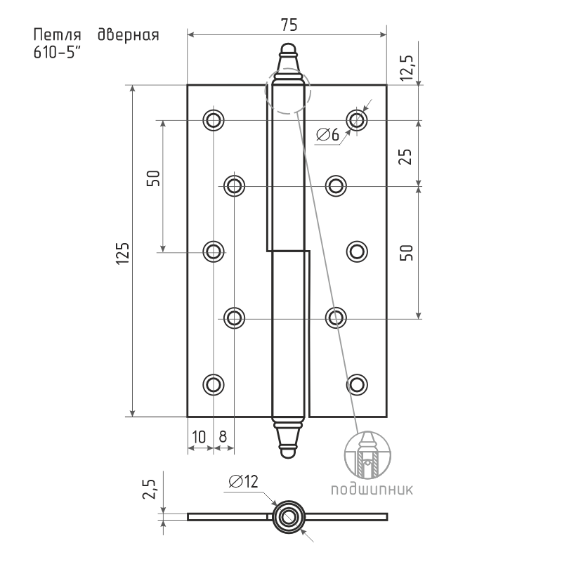 Разъемная петля для деревянных межкомнатных дверей. Левая/правая - для дверей левого или правого открывания. Материал - нержавеющая сталь 2,5 мм, декоративный колпачок. Высота 125 мм. В комплекте саморезы для установки. Гарантия 5 лет.
