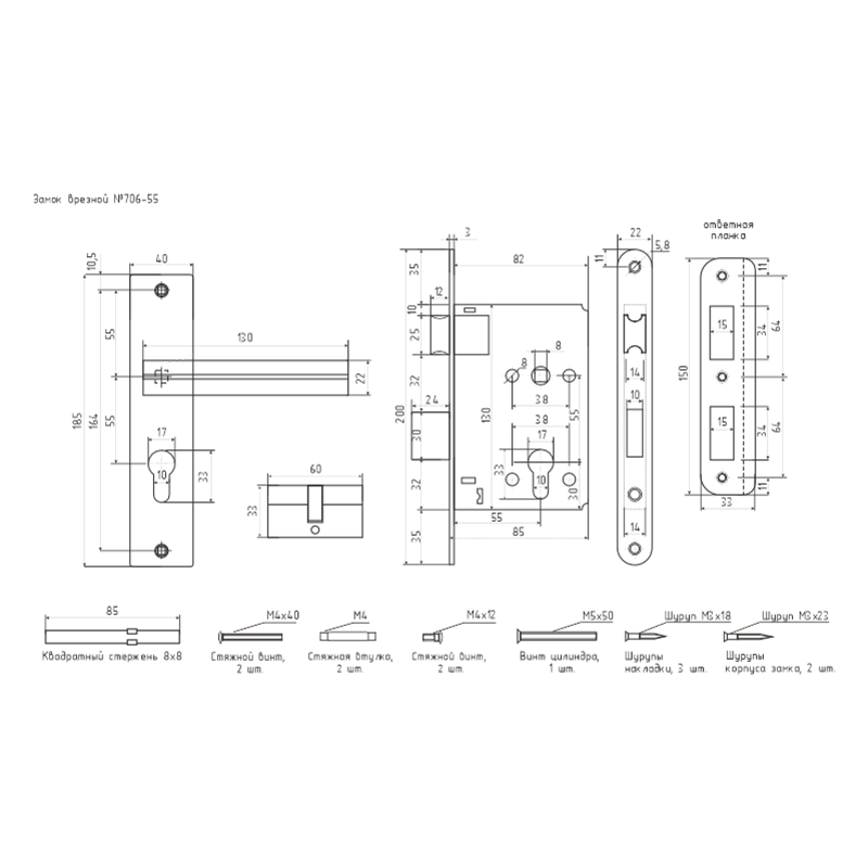 Комплект замка предназначен для установки в деревянные входные двери. В комплект входят 2 ручки на планке, корпус замка, ответная планка, цилиндровый механизм и 5 ключей. Межосевое расстояние 55 мм. Комплект универсальный, можно устанавливать на двери левого и правого типа открывания. Ручки на планке - сталь, алюминий, корпус стальной, механизм из закаленной стали. Гальваническое многослойное покрытие лицевых деталей, корпус замка имеет защитное антикоррозийное напыление. Гарантия на работу изделия 1 год.