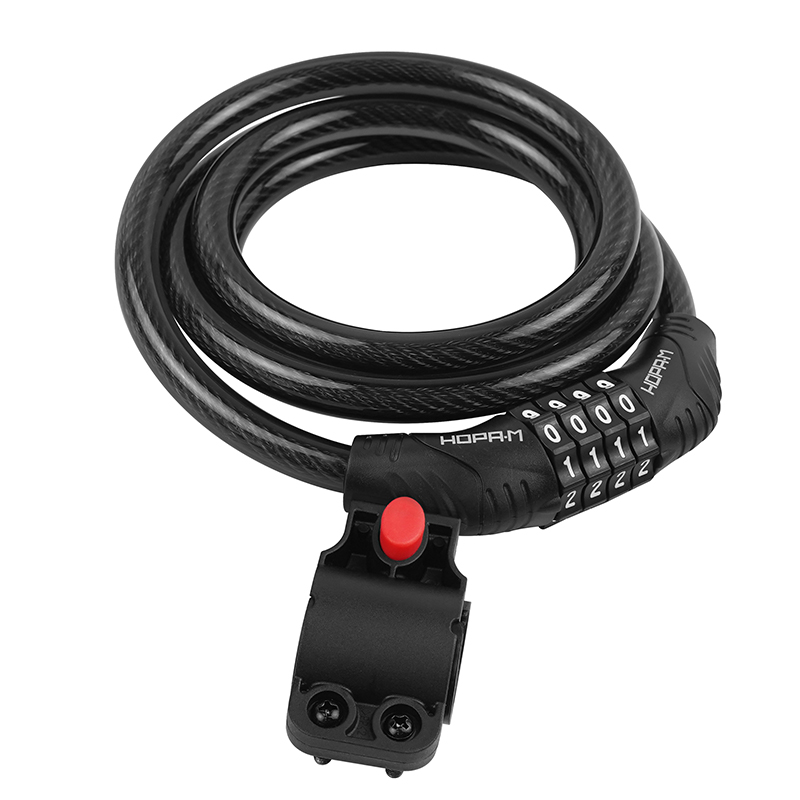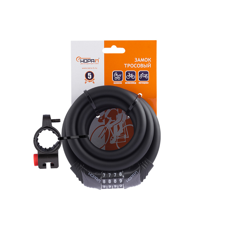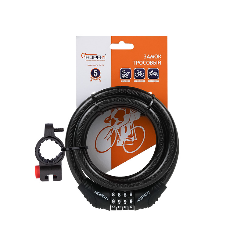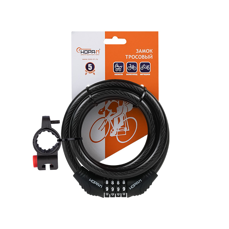Велосипедный замок-трос. Предназначен для защиты от угона велосипедов, мопедов, детских колясок. Материал изготовления - закаленная сталь (трос), пластик (кожух). Запирается на кодовый механизм, который можно перекодировать. Заводской код 0000, откройте замок. На кодовой части с торца поверните пластиковое кольцо по направлению стрелки до упора . Измените кодовую комбинацию на желаемую. Верните пластиковое кольцо в начальное положение, повернув его против часовой стрелки. Новая комбинация кода установлена. Запомните или запишите ее. Инструкция по перекодировке также есть на упаковке замка. Гарантия на работу замка 5 лет