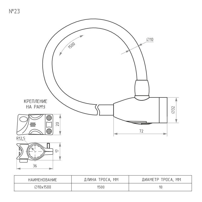 Велосипедный замок №23 с креплением на раму черный 10x1000 мм