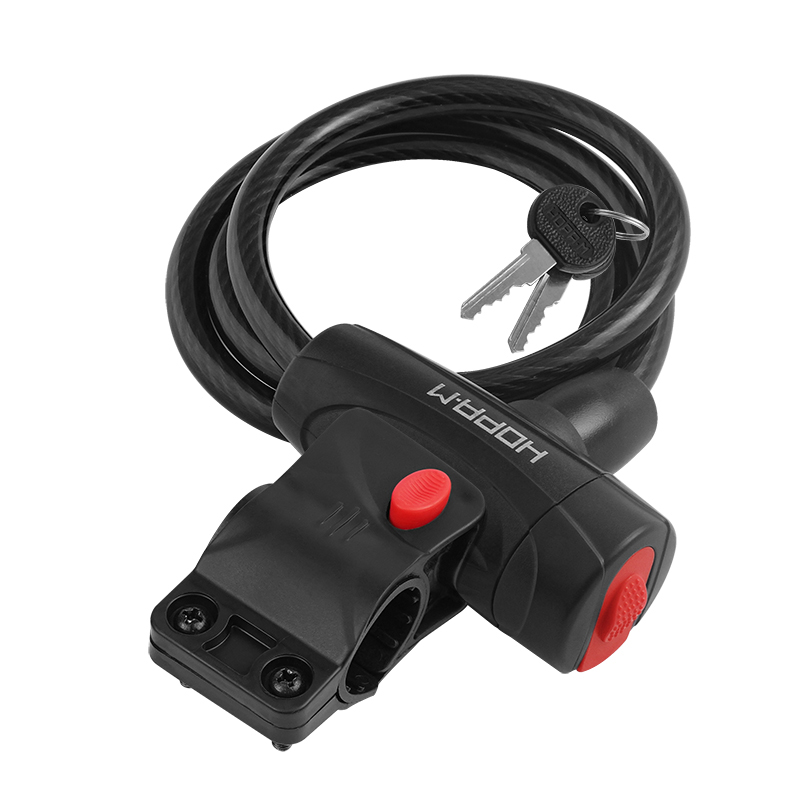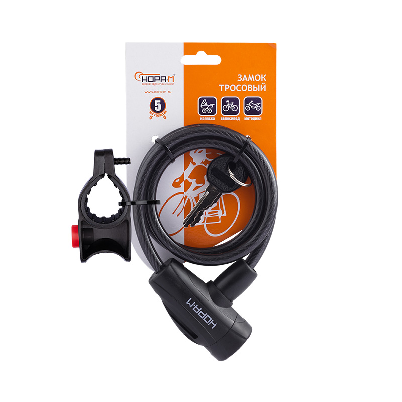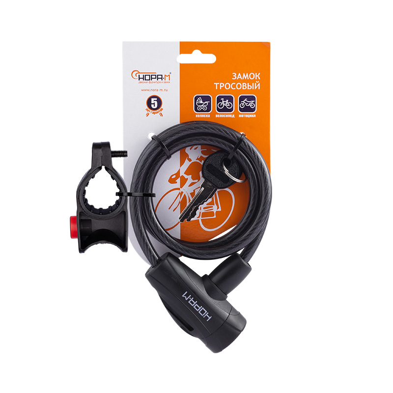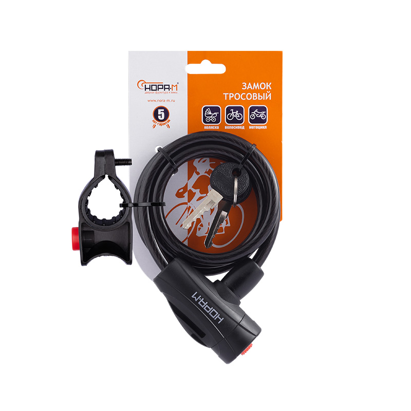 Велосипедный замок-трос. Предназначен для защиты от угона велосипедов, мопедов, детских колясок. Материал изготовления - закаленная сталь (трос), пластик (кожух). В комплекте 2 ключа, функция автоматического запирания. Имеет пластиковую заглушку, которая защищает цилиндр замка от попадания грязи и влаги. Гарантия на работу замка 5 лет