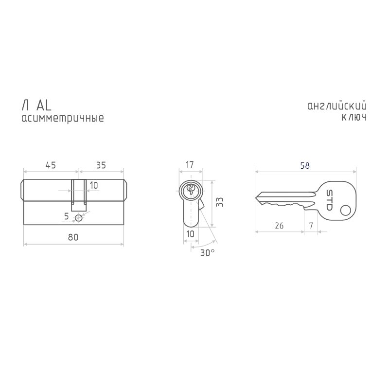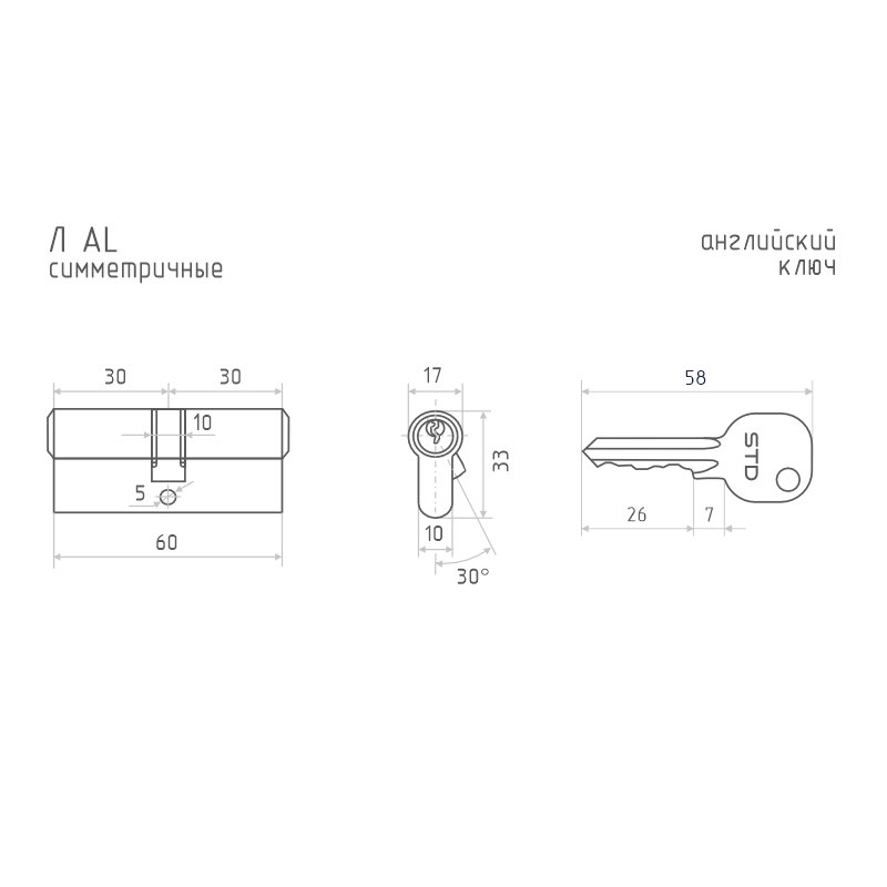 Цилиндр для межкомнатных и входных дверей бюджетной серии STD. Материал алюминий, ЦАМ. В комплекте 5 стальных английских ключей. 5 пинов. Длину цилиндра подбирайте исходя из толщины двери, с небольшим запасом под накладку. Гарантия на работу цилиндра 6 месяцев.