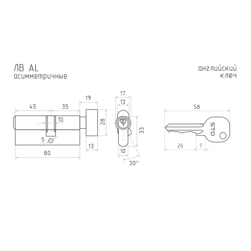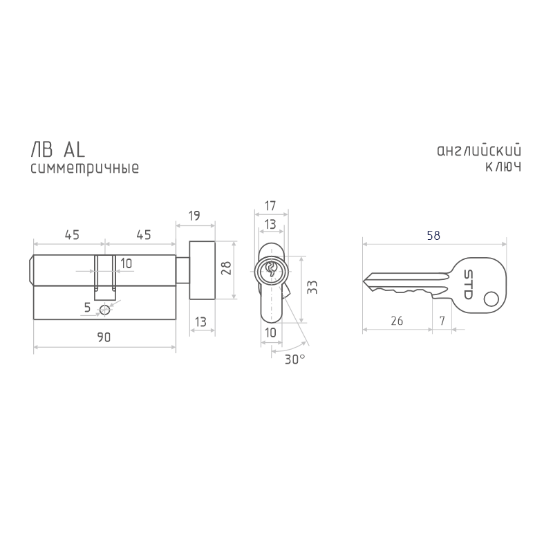 Цилиндр для межкомнатных и входных дверей бюджетной серии STD. Материал алюминий, ЦАМ. В комплекте 5 стальных английских ключей, 5 пинов. Цилиндр имеет вертушку для удобного запирания изнутри помещения без использования ключа. Длину цилиндра подбирайте исходя из толщины двери, с небольшим запасом под накладку. Гарантия на работу цилиндра 6 месяцев.