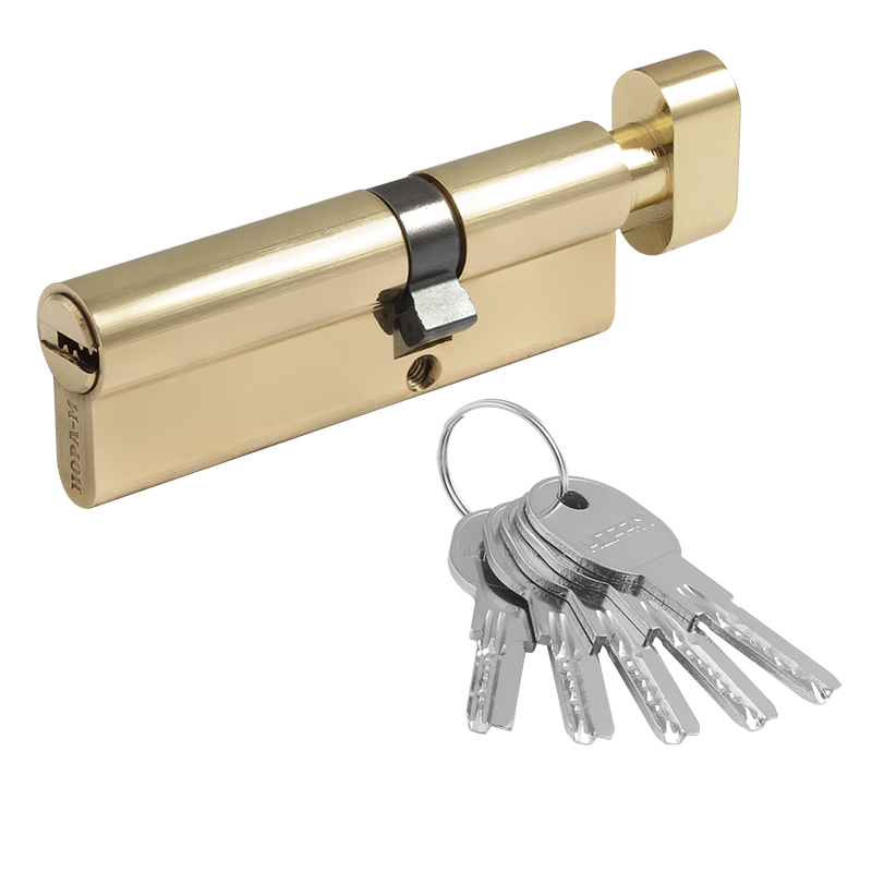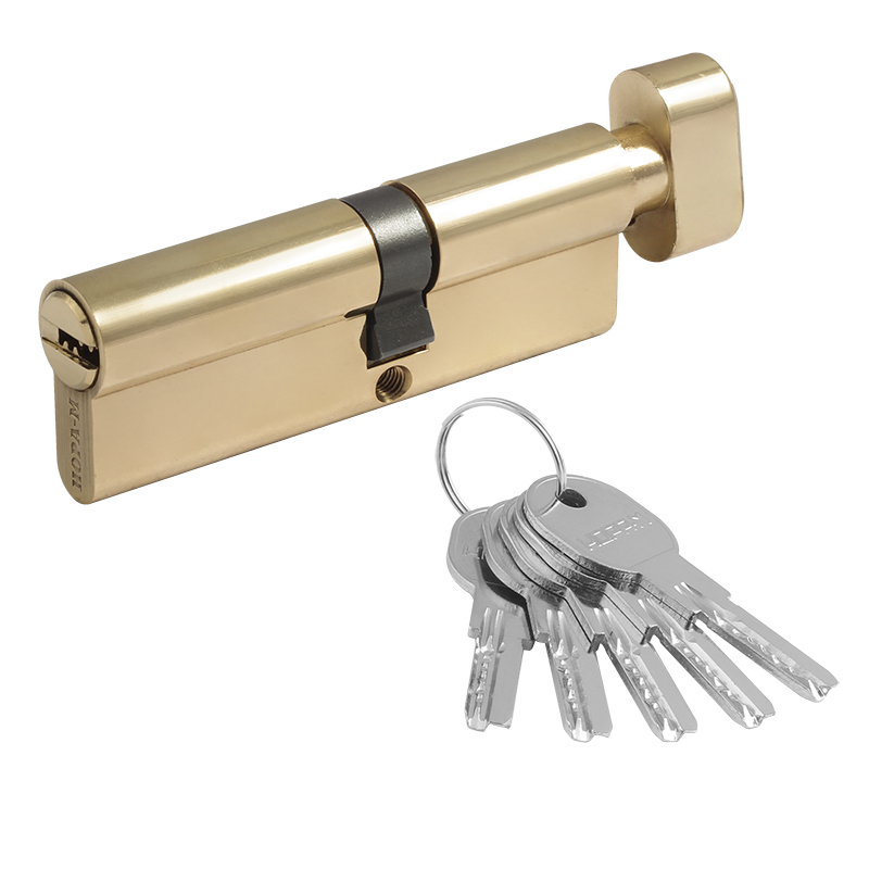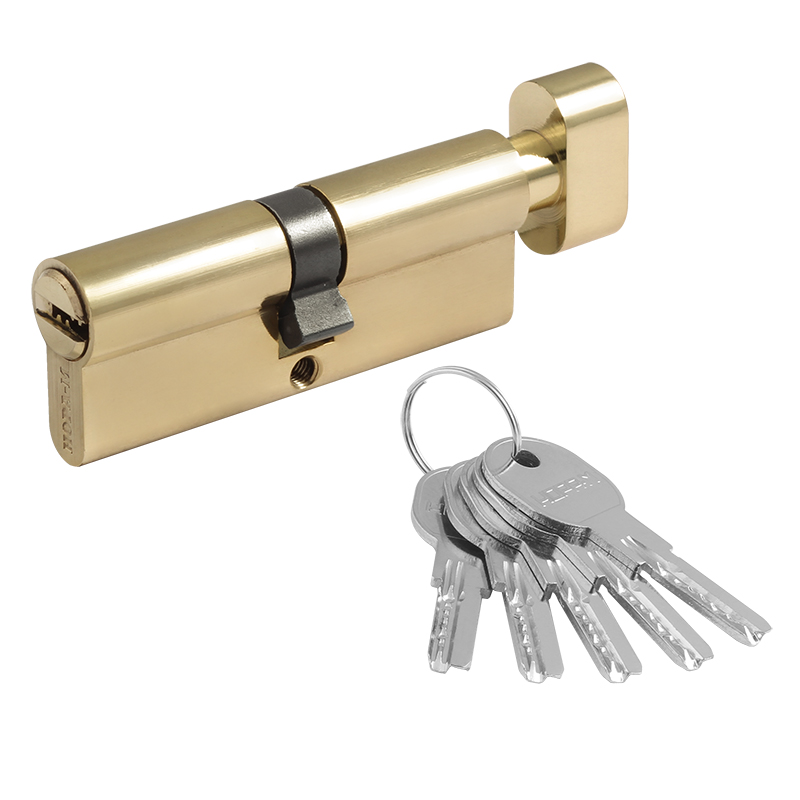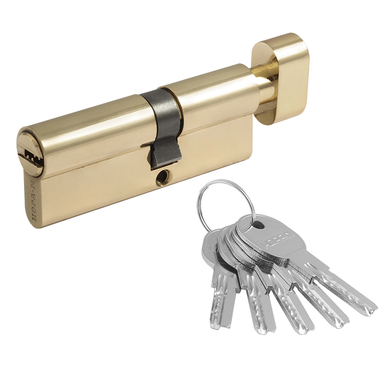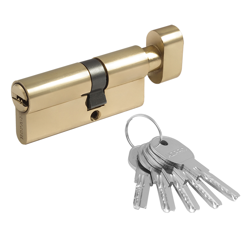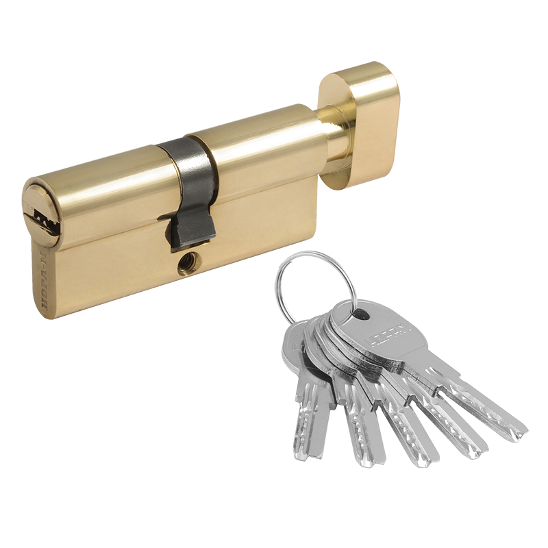 Латунный цилиндр для межкомнатных и входных дверей. 6 пинов, в комплекте 5 перфорированных удлиненных ключей из латуни. Цилиндр имеет штифт из закаленной стали против высверливания и вертушку для удобного запирания изнутри помещения без использования ключа. Ресурс работы более 100.000 циклов. Длину цилиндра подбирайте исходя из толщины двери, с небольшим запасом под накладку. Гарантия на работу цилиндра 5 лет
