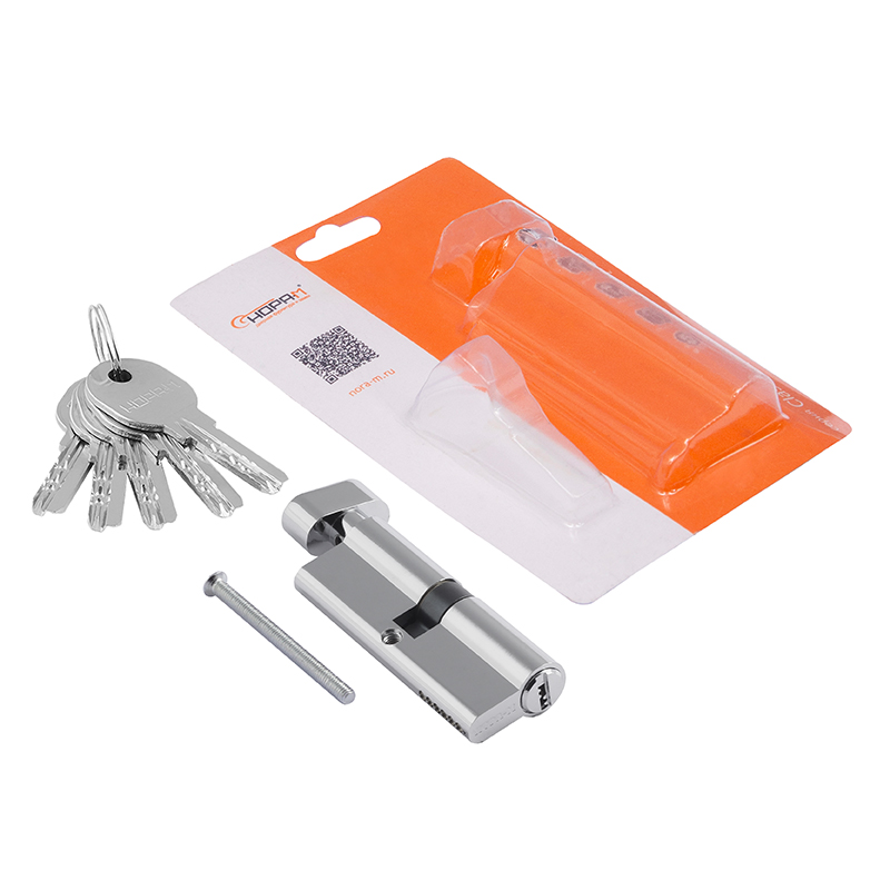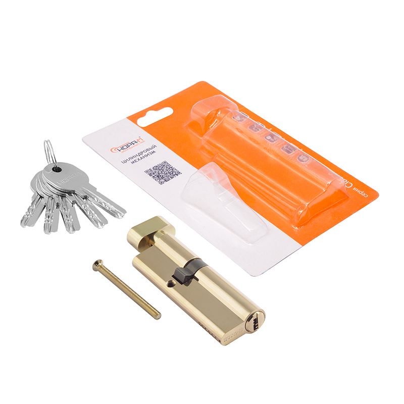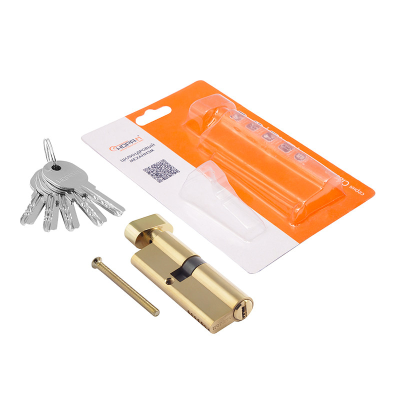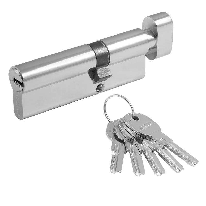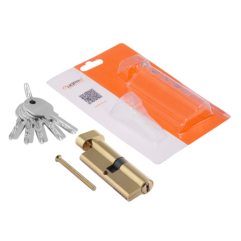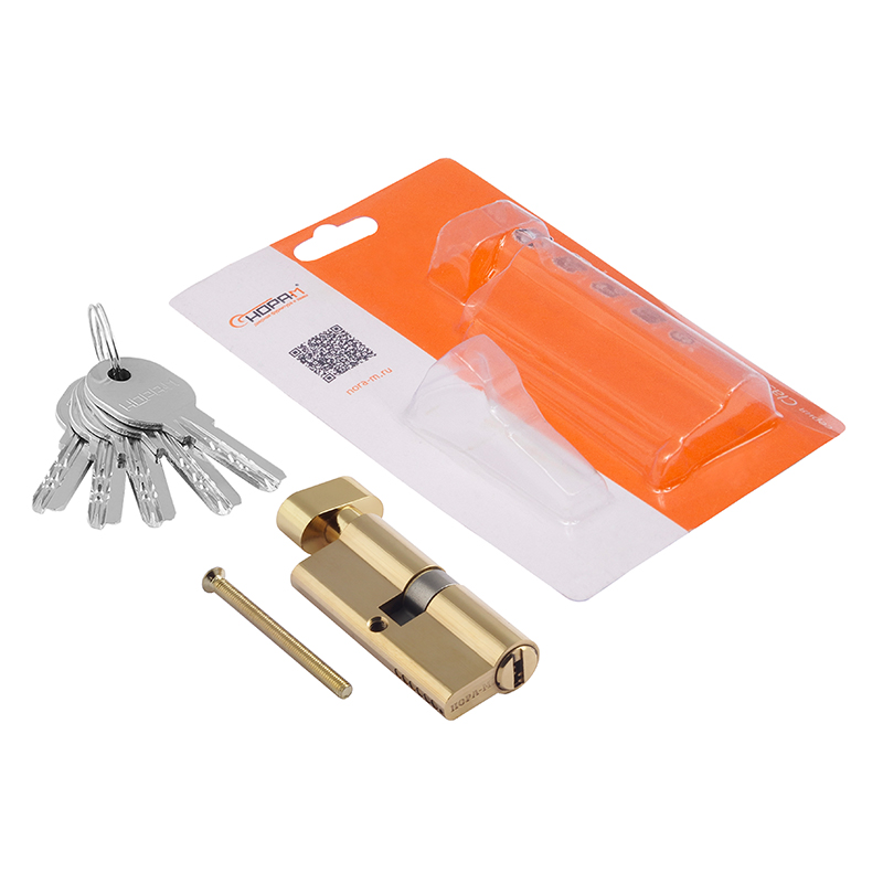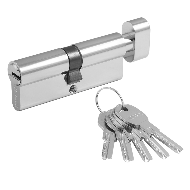 Латунный цилиндр для межкомнатных и входных дверей. 6 пинов, в комплекте 5 перфорированных удлиненных ключей из латуни. Цилиндр имеет штифт из закаленной стали против высверливания и вертушку для удобного запирания изнутри помещения без использования ключа. Ресурс работы более 100.000 циклов. Длину цилиндра подбирайте исходя из толщины двери, с небольшим запасом под накладку. Гарантия на работу цилиндра 5 лет